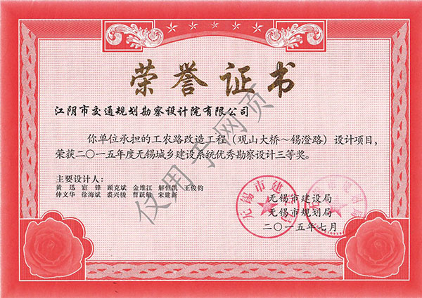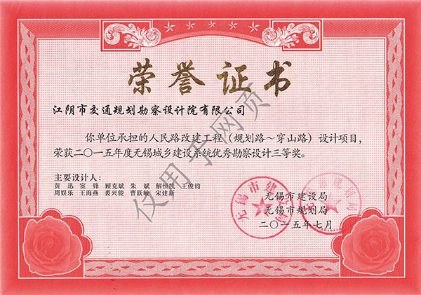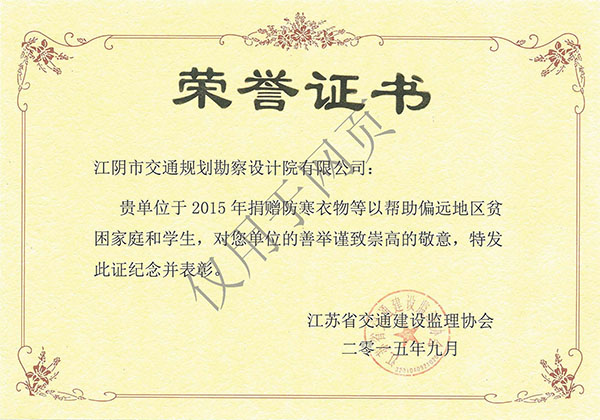 江阴市交通规划勘察设计院有限公司获2015年荣誉证书